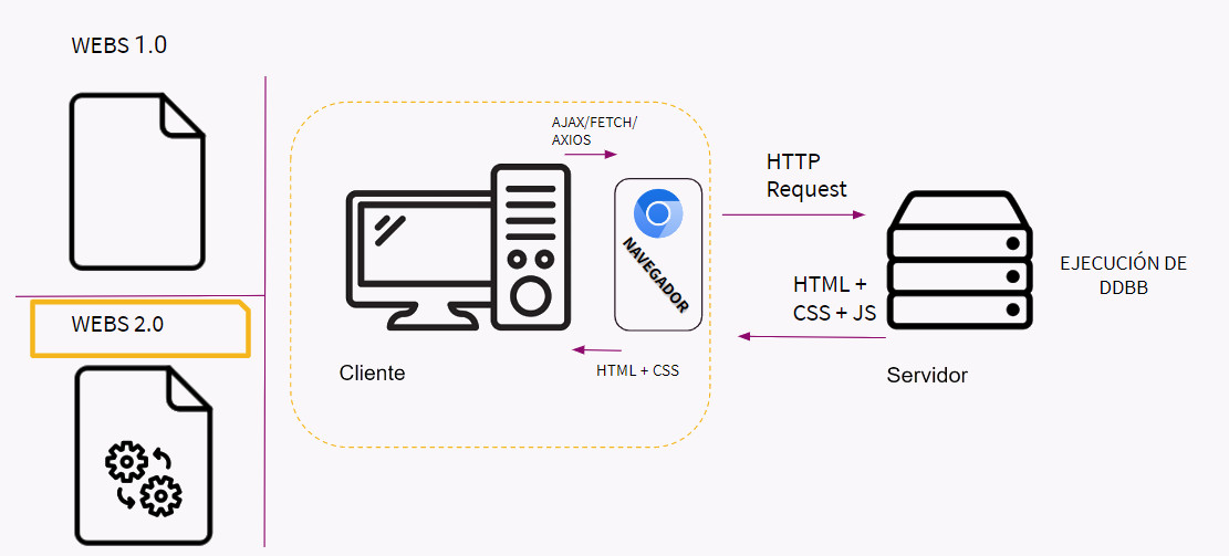 Aunque veamos el mundo de internet con gran inmediatez y casi mágico, la realidad es que mediante cables, el cliente le solicita al servidor que le muestre la información de la página. El servidor procesa esa petición y una vez procesada, se la envía al navegador del cliente. El cliente en dicho navegador vuelve a procesarla y entonces ya se le muestra dicha página.