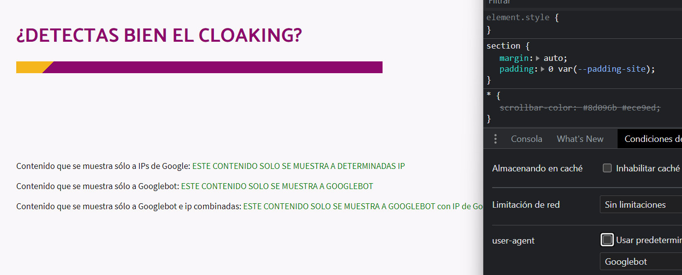 Cabe decir que el método de cloaking más fácil de detectar (aunque era previsible), es el del User-Agent.