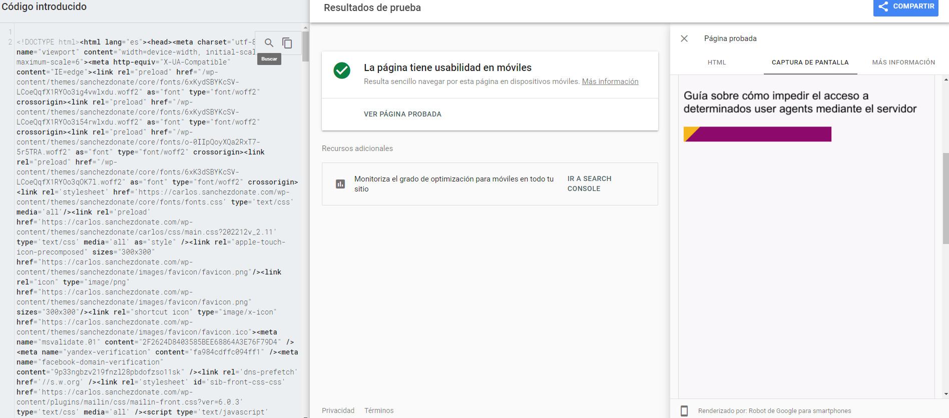 Cuando la realidad es que la página si que tiene usabilidad en móviles, es sólo que si la bloqueo con el robots.txt le impido saberlo: