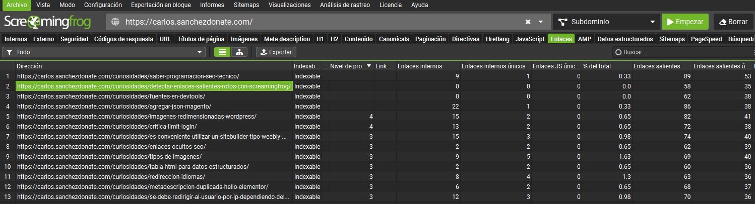 En esta tabla puedes ver el recorrido mínimo de enlaces que puedes hacer para llegar hasta esa página y la cantidad de enlaces internos que tienes hacia la misma.