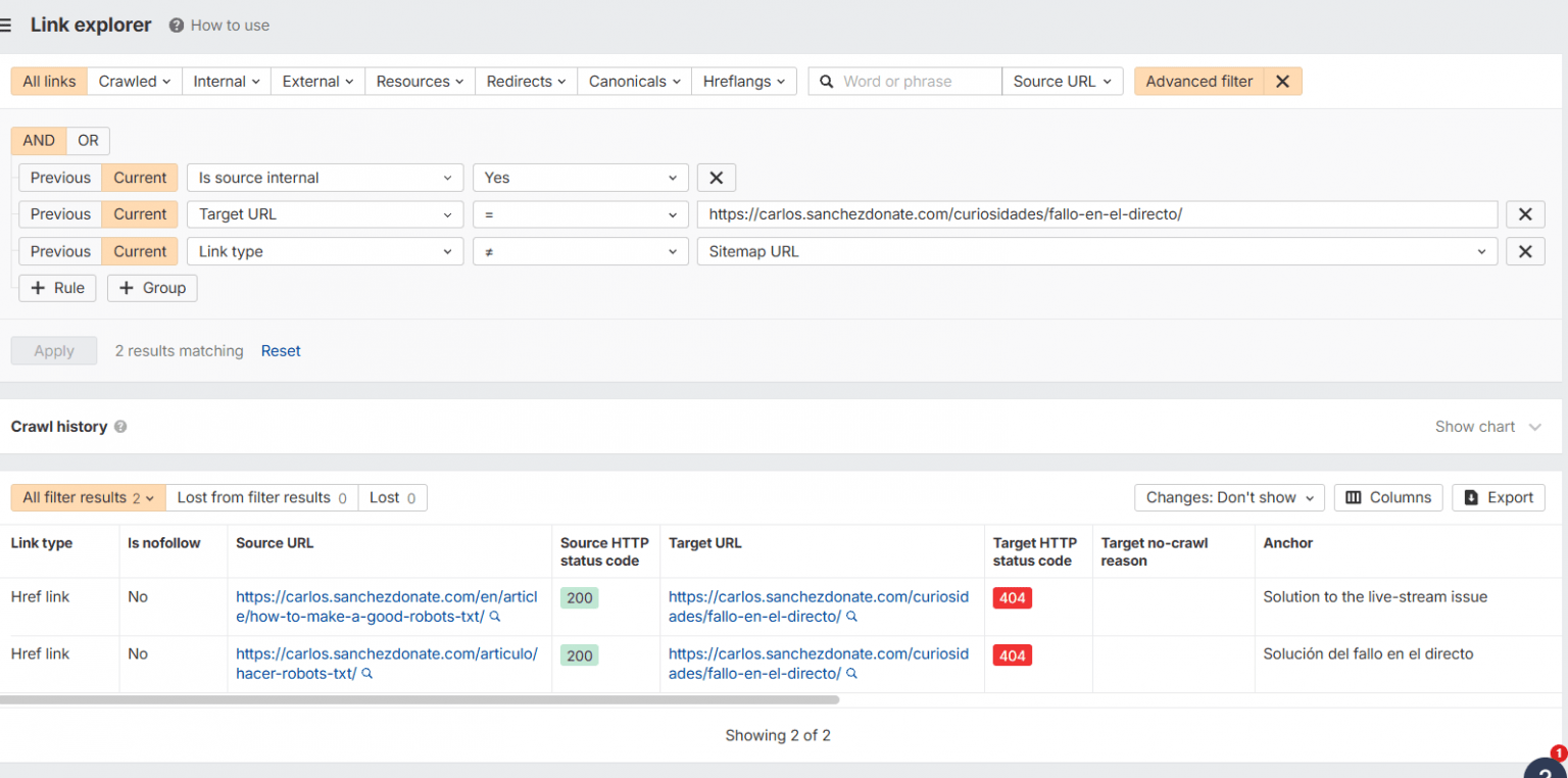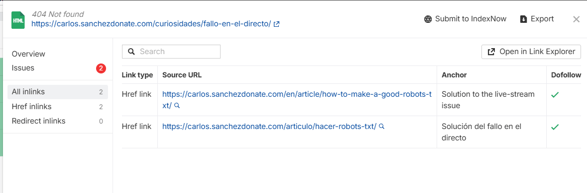 Desde Site Explorer lo puedes hacer viendo las páginas más enlazadas y luego filtrando más el resultado. También desde Backlinks en enlaces rotos, pero esto solo te ofrecerá la información de enlaces desde otros dominios (lo cual también necesitamos reparar y te enseño cómo, pero me quiero centrar en los internos que tiene más miga).