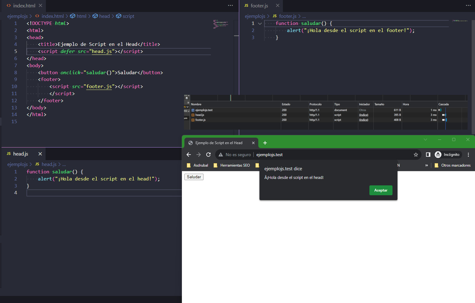 Para entender el experimento, he creado 2 Scripts con el mismo comportamiento que arrojan mensajes distintos (para distinguirlos) y así comprobar de forma simple el comportamiento de este lenguaje de programación en un navegador moderno.