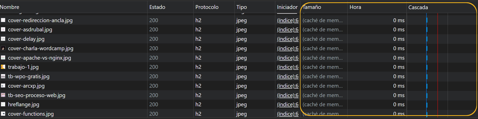 - Cascada: El orden en el que se han descargado y procesado los archivos, y en cuanto tiempo.