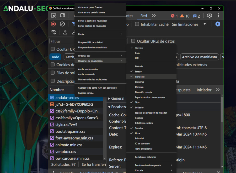 Importante: La versión de HTTP no aparece por defecto. (Click derecho > Opciones de encabezado > Protocolo)