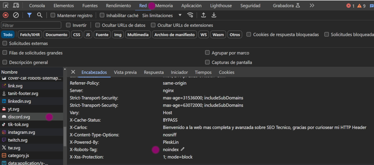 Si haces Click en cualquiera de los archivos que se descargan en tu ordenador, tienes la opción de examinar los encabezados, incluyendo si tienen la x-robots: