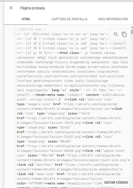 Si vamos al inspector de páginas de Search Console. Podemos analizar el HTML del último rastreo que hizo Google e incluso probarlo en tiempo real.