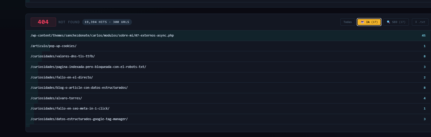 Con esta herramienta que hicimos para nosotros mismos y tenemos subido de forma pública, puedes analizar los Logs respecto a lo que te interesa para SEO y GEO.