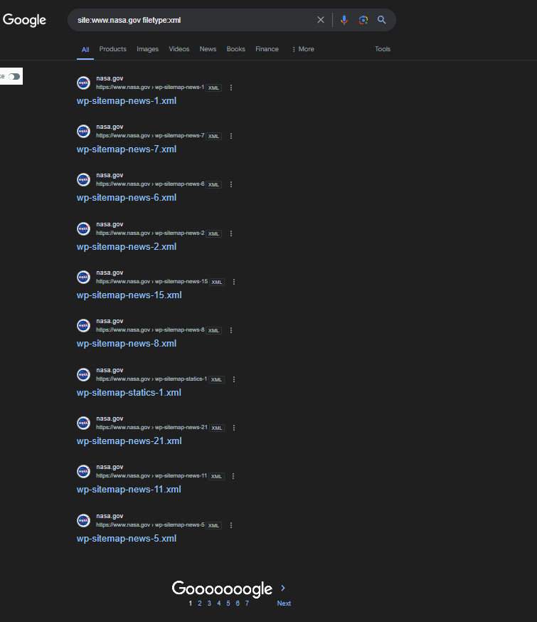 Combinando varios operadores podemos sacar información de gran utilidad. Por ejemplo podemos encontrar todos los sitemaps de la nasa. Ya que aunque no haya nada en su robots.txt, tienen estos sitemaps indexados.