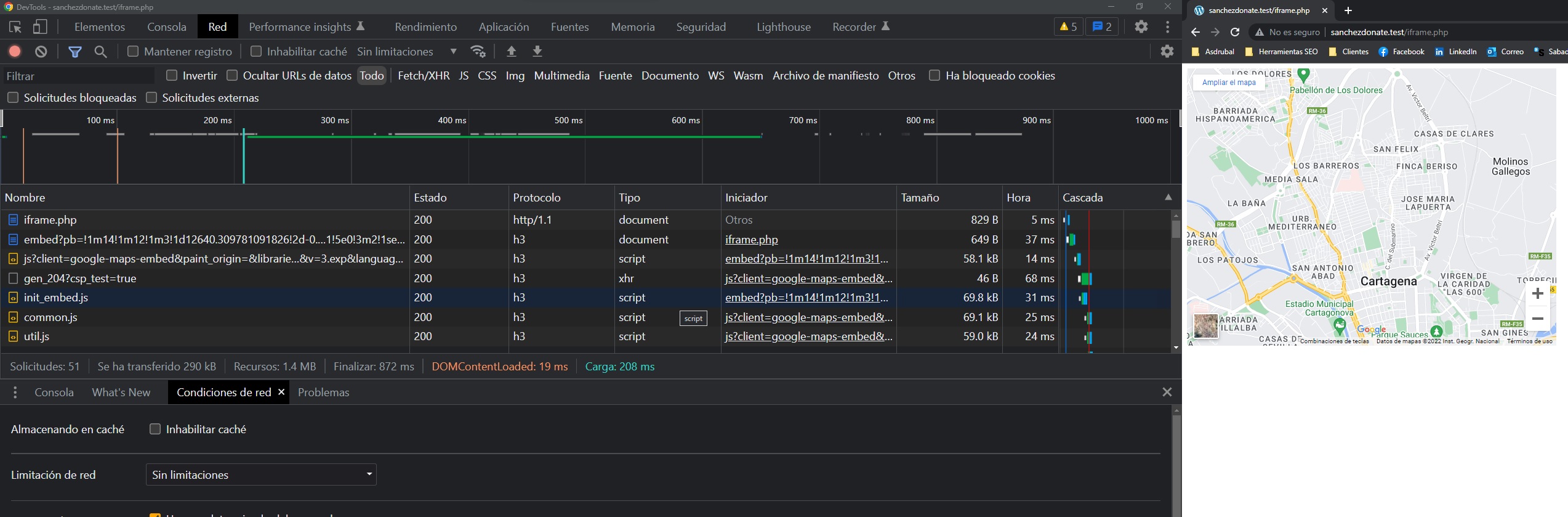 Si creamos una página en la que solo esté funcionando el iframe (sin ningún elemento que altere la prueba), nos encontramos que ha tenido que cargar todo el contenido de Google Maps.