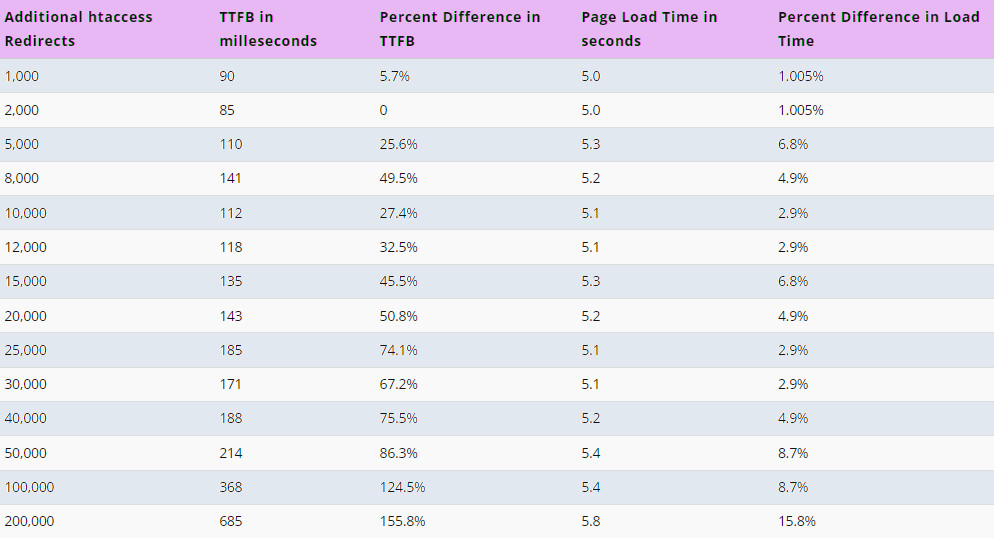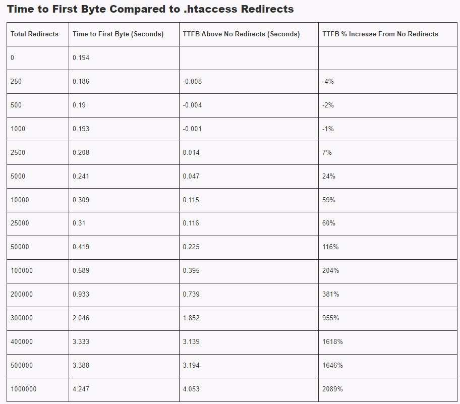 En cualquier caso, podemos observar como en el caso de SEOMike que hasta las 30.000 líneas de redirecciones no empieza a haber un cambio significativo en la performance.