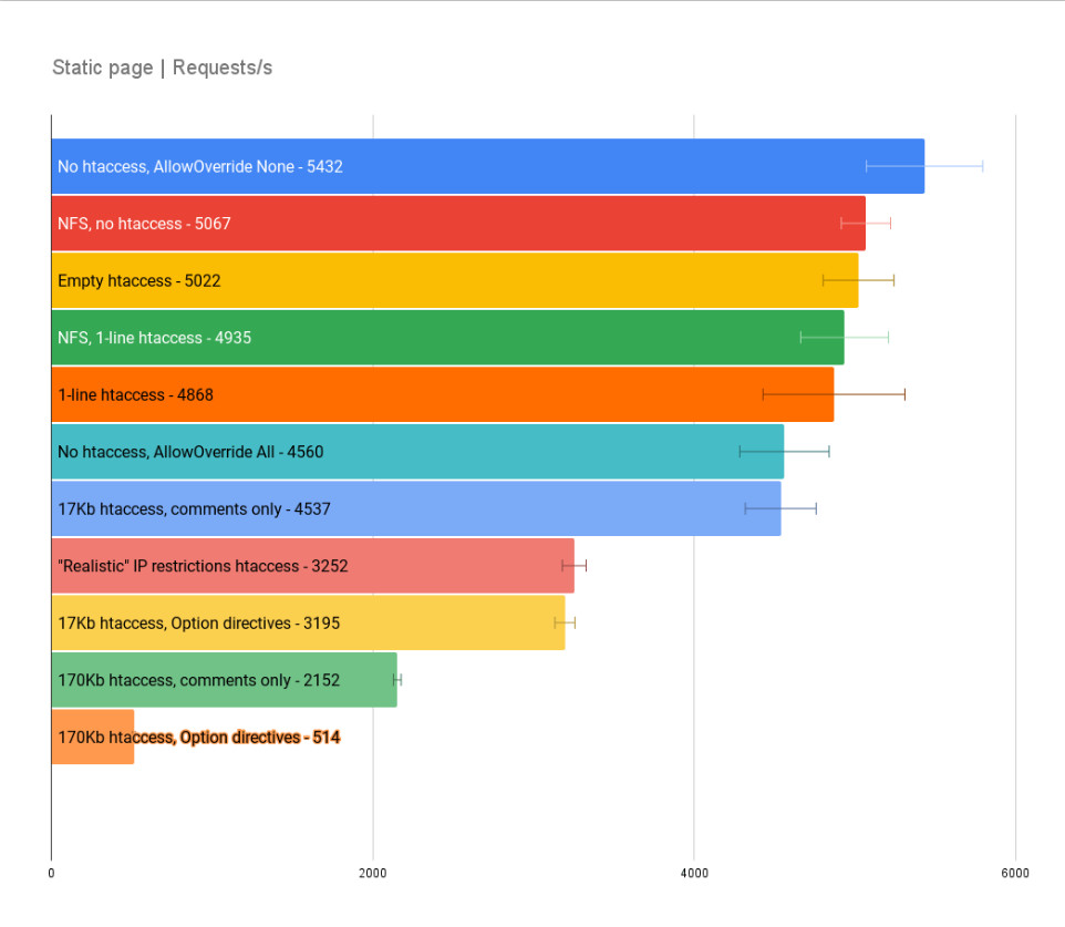 - Impacto moderado en sitios estáticos: Un archivo .htaccess pequeño tiene un impacto limitado en la velocidad de respuesta de sitios estáticos, pero su presencia aún así afecta el rendimiento. Permitir los archivos .htaccess (AllowOverride All) reduce el rendimiento en aproximadamente un 16% en comparación con su deshabilitación total.