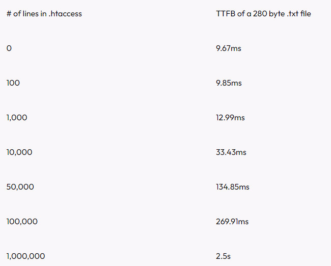 - Impacto en el tiempo hasta el primer byte (TTFB): A medida que aumenta el número de líneas en un archivo .htaccess, el TTFB de los archivos servidos en el mismo directorio aumenta significativamente. Por ejemplo, un archivo .htaccess con 1,000,000 de líneas puede llevar a un TTFB de hasta 2.5 segundos.