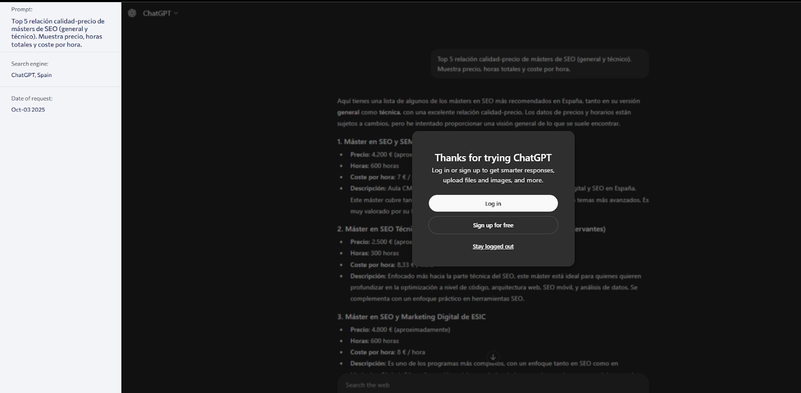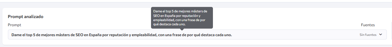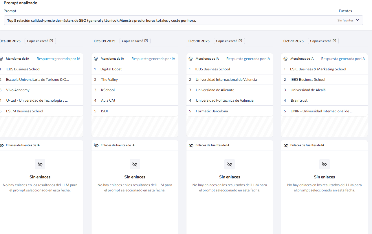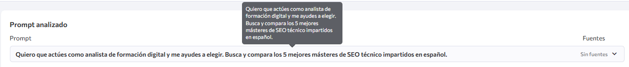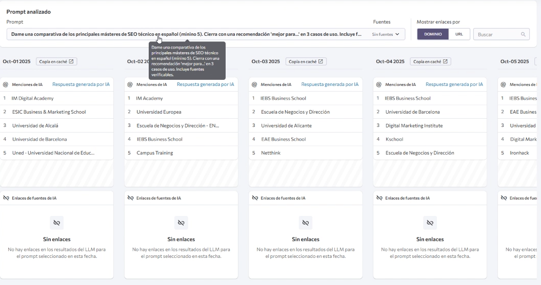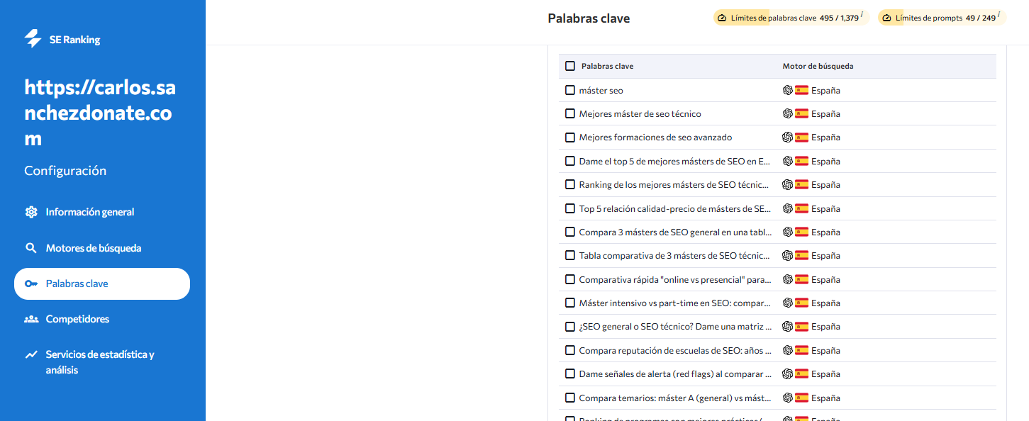 Como SE Ranking te permite poner múltiples Prompts y resultados, nos dimos cuenta que a la hora de buscar de forma neutra sobre un máster de SEO Técnico mencionaba de forma continua ciertas palabras que en nuestro contenido no aparecían tanto.