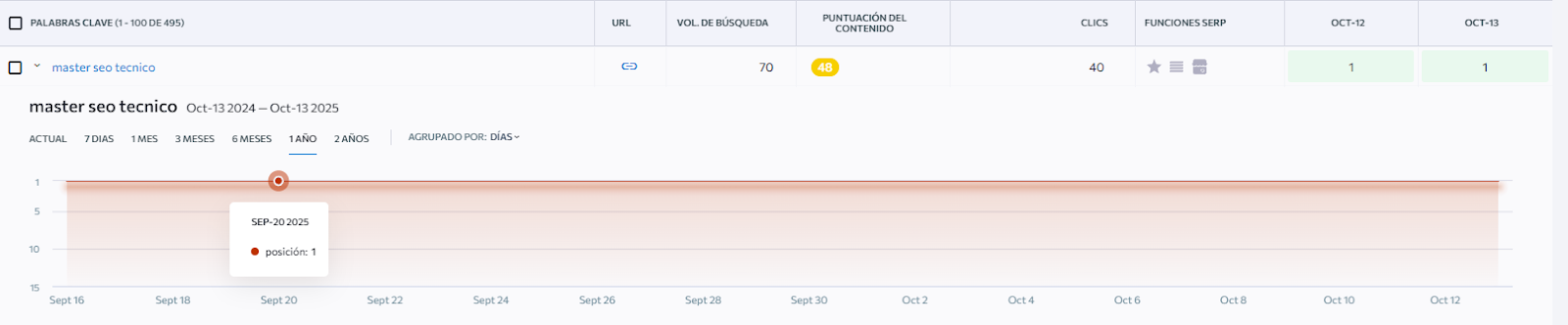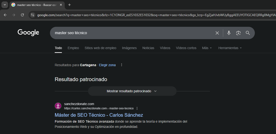 En este caso “Máster SEO Técnico” lleva mucho tiempo de forma estable en la primera posición de forma orgánica.