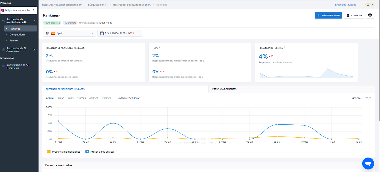 La forma que tiene de funcionar SE Ranking es que tu le das un listado de Prompts y SE Ranking lo pone día a día y te muestra de forma gráfica todos los datos de las veces que te han mencionado o que te han citado como fuente.