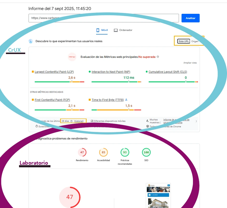 Es importante tener en cuenta lo que he comentado, lo que nos interesa a nivel Core Web Vitals es el CrUX (señalado en azul en la siguiente imagen) y tanto la información de laboratorio (señalada en morado en la siguiente imagen), como origen o la URL en concreto, nos puede dar pistas o información también acerca del TTFB.