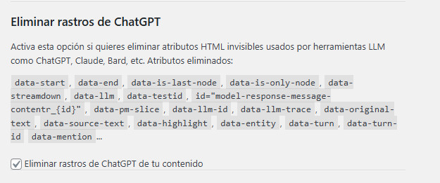 En cualquier caso, el plugin cuesta 30€ y es entendible que no quieras rascarte el bolsillo, por otro lado, no solo te elimina el data-start y data-end, sino la traza que suela generar cualquier LLM y además actualizan de forma continua, por lo que no te tienes que preocupar de nuevos trazos que deje ChatGPT o cualquier otra IA. En cualquier caso, si lo quieres hacer por ti mismo:
