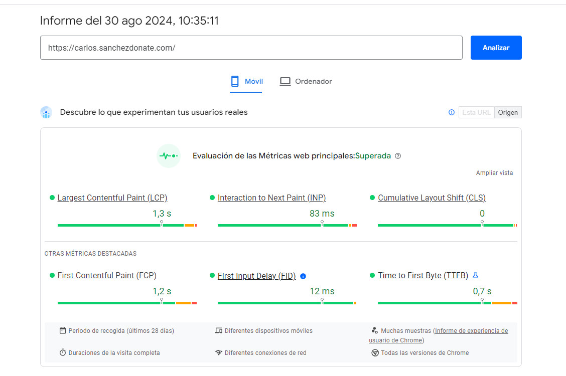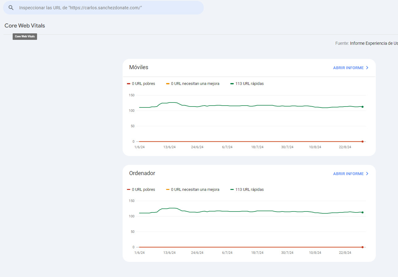 Sin embargo, es importante destacar que estos datos muestran un promedio de las experiencias de los usuarios, lo que significa que no necesariamente indican si tu web es rápida o no en términos absolutos. Solo muestran cómo se ha comportado en promedio para los usuarios reales. Además, si realizas cambios en tu sitio, deberás esperar 28 días para que estos se reflejen de manera justa en estas métricas. Es en la Search Console donde puedes ver cómo Google está tomando en cuenta la velocidad de tu web.