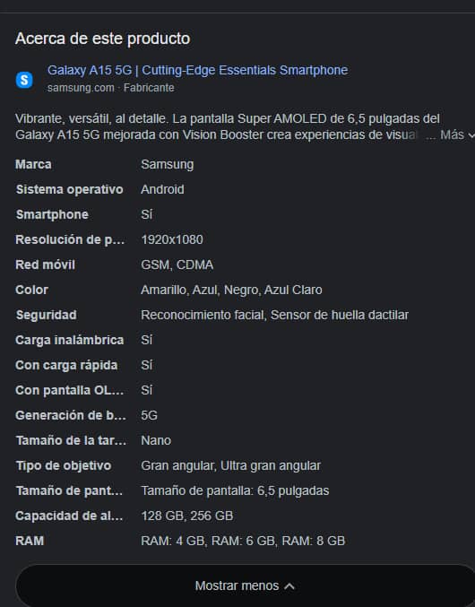 Al seleccionar la pestaña "Productos", solo verás resultados directamente relacionados con productos, conocidos como Product Intent Units. En cambio, si eliges "Sitios de productos", aparecerán resultados de páginas que venden productos. Estos resultados pueden incluir un carrusel de productos con enlaces hacia cada uno.