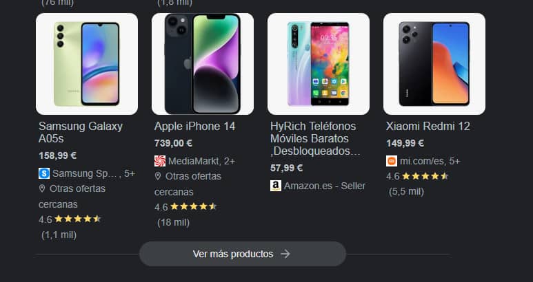 El enlace "Ver más productos" bajo el listado inicial siempre te llevará a una página de resultados filtrada por productos o sitios de productos. Esto aplica principalmente para búsquedas de compra de productos y se asemeja al proceso para búsquedas locales.